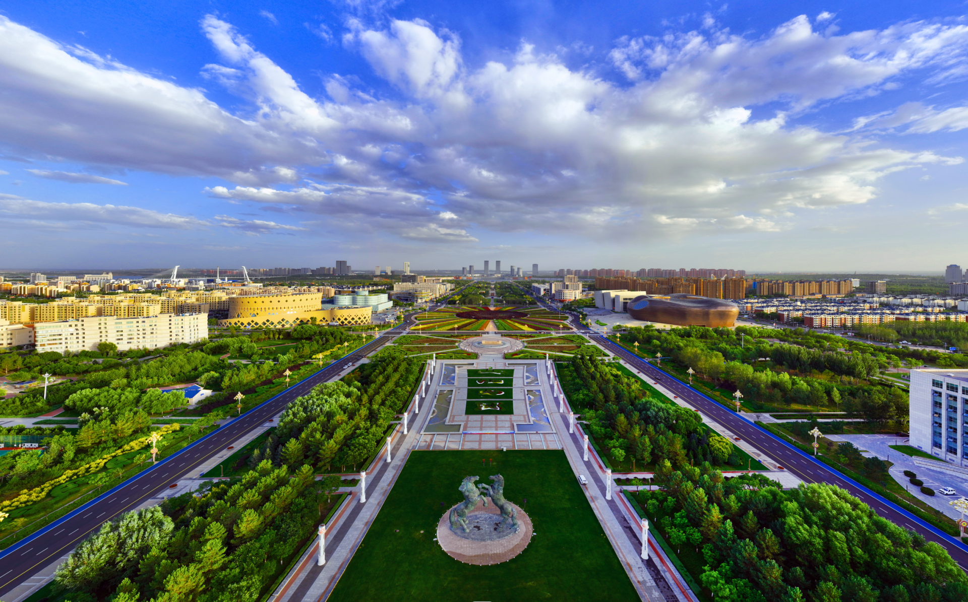 (舞台灯光再次转换,展现出鄂尔多斯现代化的城市景象。)